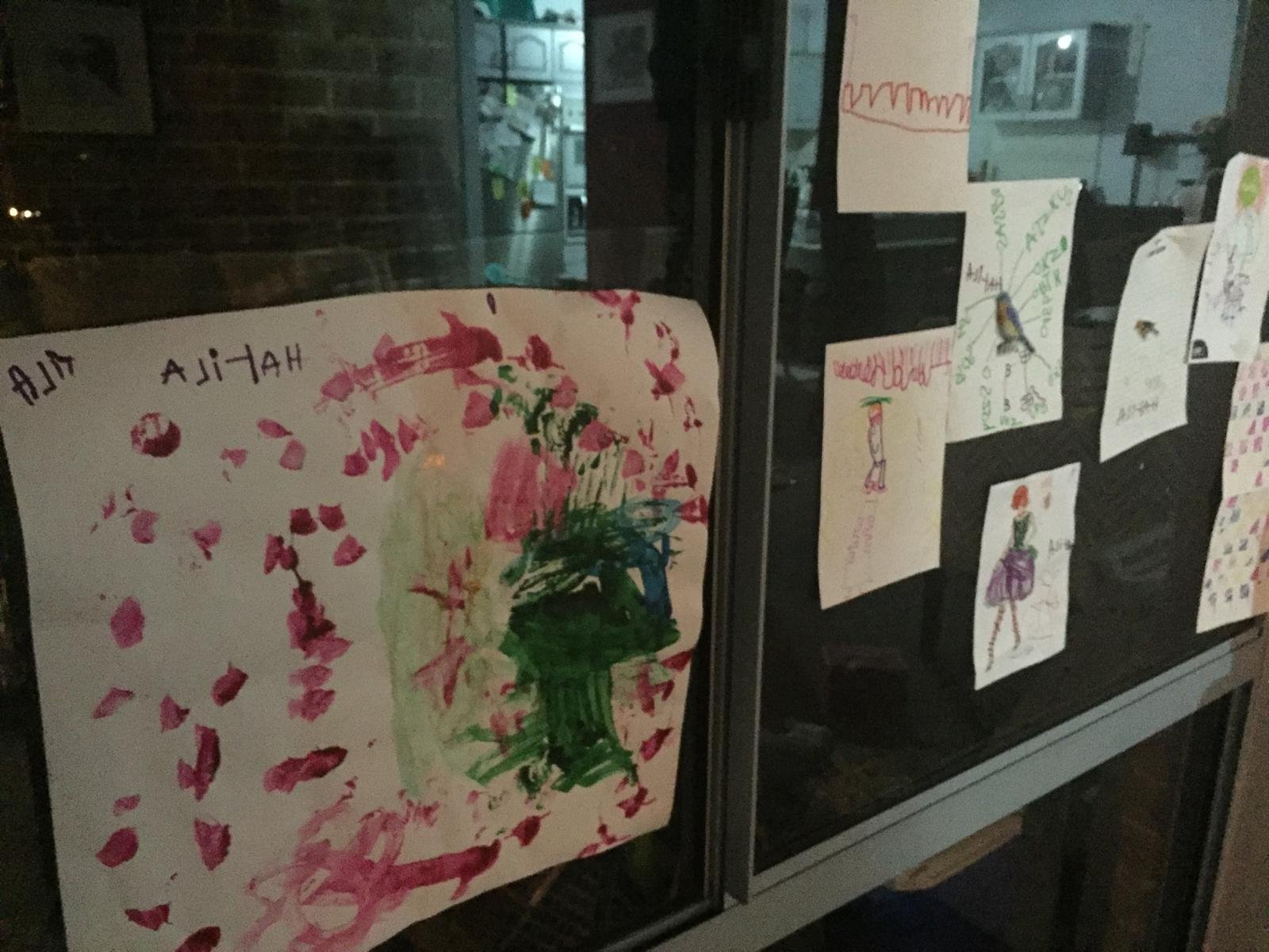 The living room was surrounded by floor-to-ceiling windows, and those windows were completely covered in my daughter’s artwork. Drawings taped everywhere. Layer on top of layer. Her own little gallery.